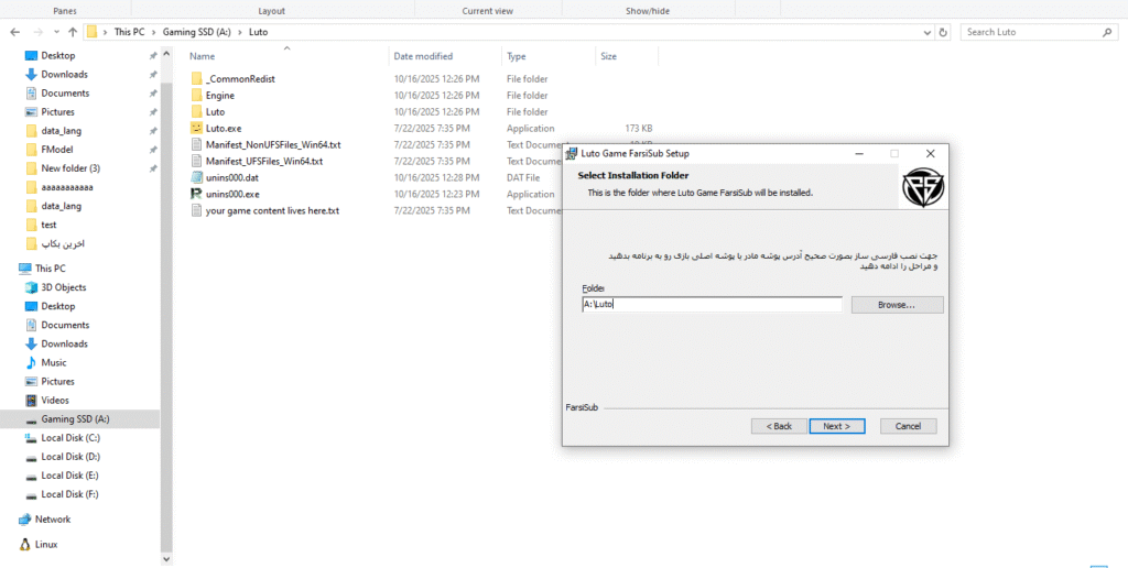 در بخش نصب فارسی ساز روی بازی حتما آدرس پوشه مادر بازی یا پوشه اصلی بازی را به برنامه بدهید در غیر اینصورت فارسی ساز بصورت اشتباه نصب میشود و بازی فارسی نمیشود برای مثال مسیر زیر به عنوان پوشه مادر یا پوشه اصلی بازی هست و فارسی ساز باید در مسیر اینطوری نصب شود